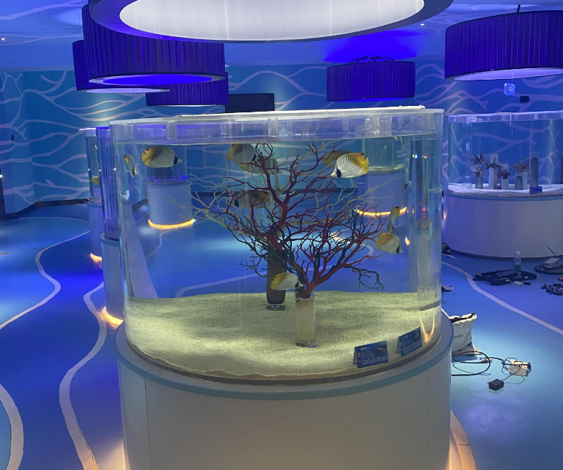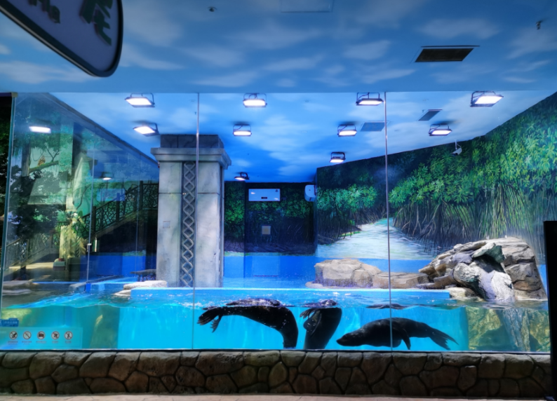 其中大海水池总水量达2340立方米,采用石英砂过滤、蛋白质分离过滤和生化过滤三种方式混合过滤的方式,并采用臭氧消毒方式。
