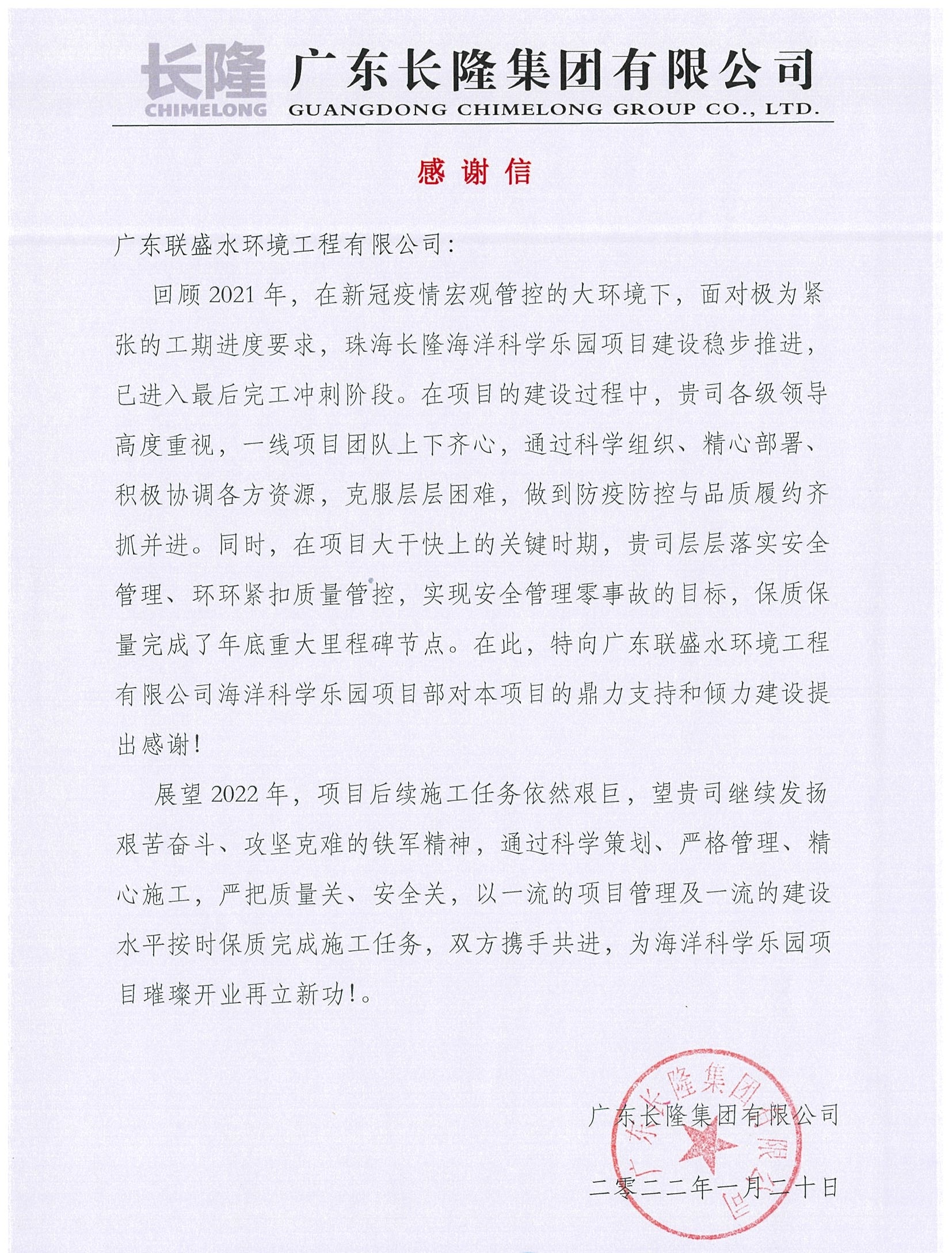 近日,广东联盛水环境工程有限公司收到了一封来自广东长隆集团有限公司的感谢信,信内容如下: