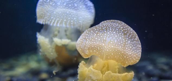 神奇水母(Sea Jellies) 展区,半透明的无脊椎动物在 LED 灯槽中浮动,您可欣赏这一灯光与音乐完美融合的景象。