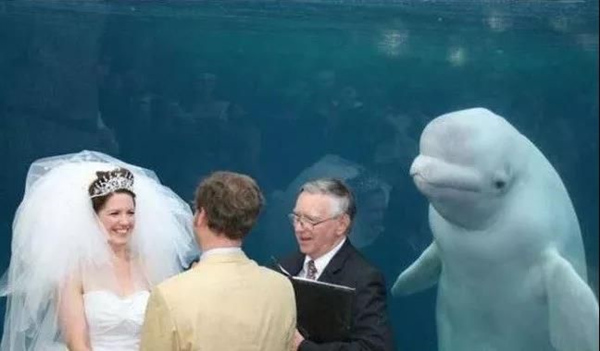 美国一对新婚夫妇在水族馆中拍摄结婚照时,一只明星白鲸朱诺突然闯入镜头中,成功抢镜,一时刷爆社交媒体。