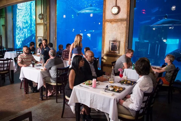 在水族馆的另一边,是当地人气的沉船餐厅,一边品尝美食一边可以通过玻璃欣赏各种游泳的鱼和海底世界。